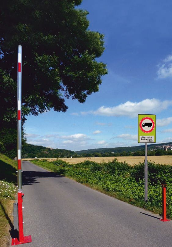 Verzinkt stalen en gecoate (RAL3020) slagboom met contragewicht, steunpaal of pendel.