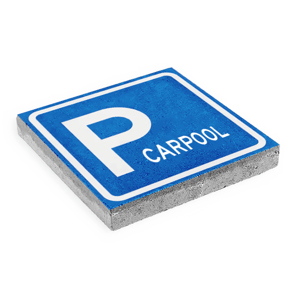 Betonnen stoeptegel bedrukt met het herkenbare parkeren symbool (P + carpool). Parkeertegels zijn een goede herkenbare aanvulling op verkeers- en parkeerborden
