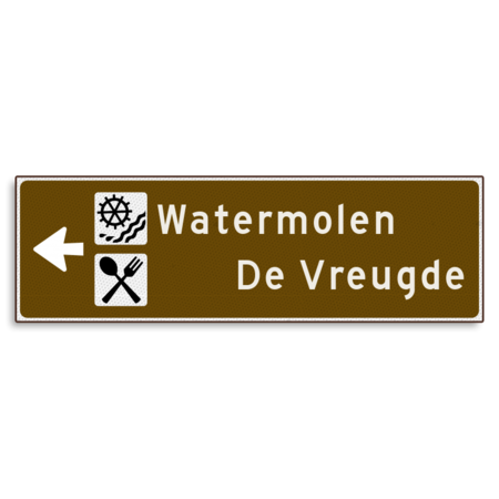 Verwijsbord KOKER Bruin/wit/zwart - pijl links, 2 regelig met 2 pictogrammen - Klasse 3 reflecterend