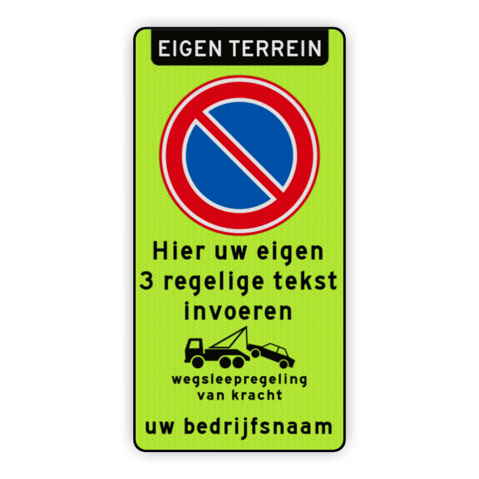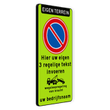 Parkeerverbod RVV E01 fluor + eigen tekst + wegsleepregeling + (bedrijfs)naam