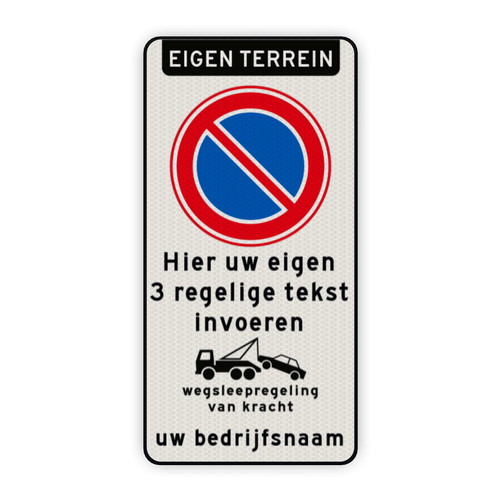 Parkeerverbod RVV E01 + eigen tekst + wegsleepregeling + (bedrijfs)naam