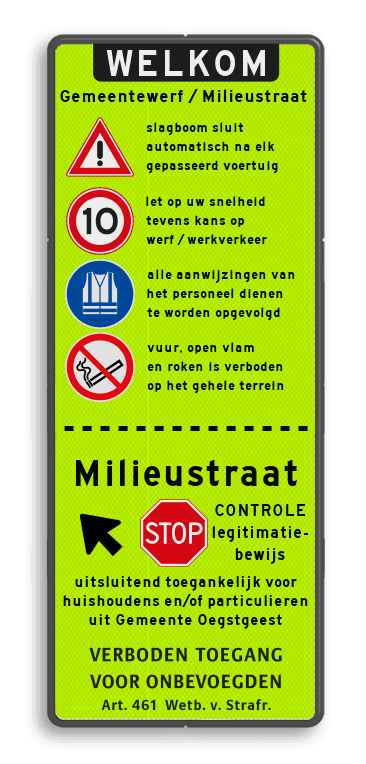 Aluminium informatiebord met een dubbel omgezette rand met print van tekst / pictogrammen in reflectieklasse 3 (incl. anti-graffiti laminaat).