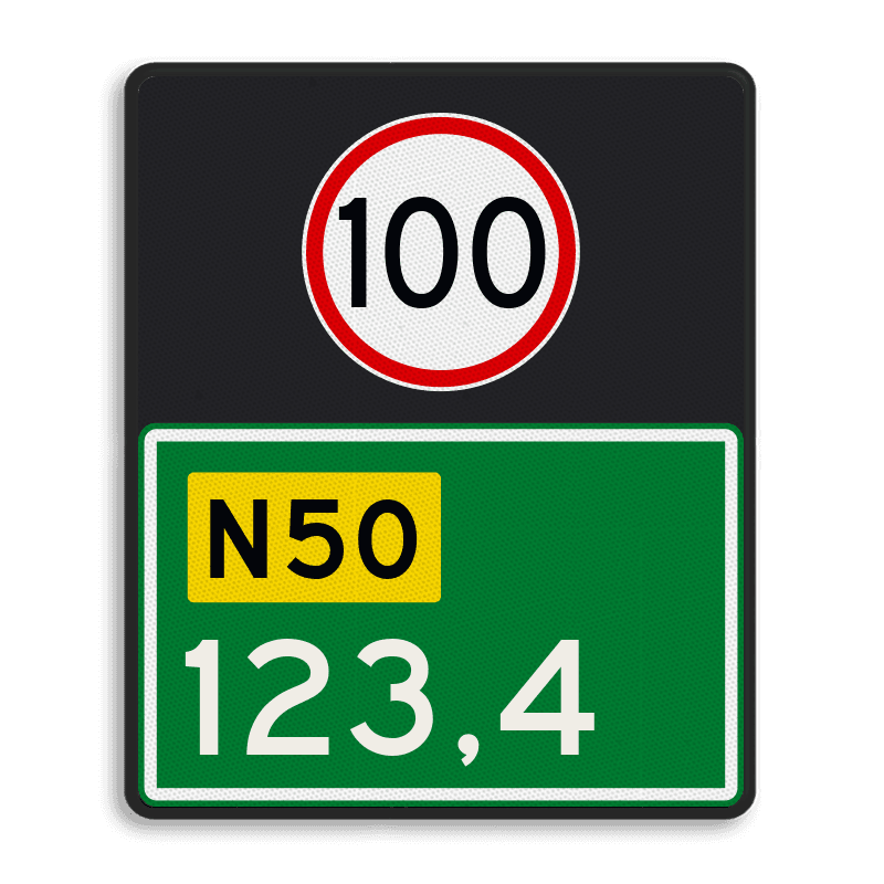 Aluminium hectometerbord met een dubbel omgezette rand met print van tekst / pictogrammen in reflectieklasse 3 (incl. anti-graffiti laminaat).