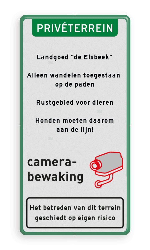Landgoed “de Elsbeek” . Alleen wandelen toegestaan op de paden . Rustgebied voor dieren . Honden moeten daarom aan de lijn!