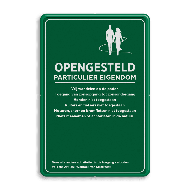 Vrij wandelen op de paden Toegang van zonsopgang tot zonsondergang Honden niet toegestaan Ruiters en fietsers niet toegestaan Motoren, snor- en bromfietsen niet toegestaan Niets meenemen of achterlaten in de natuur