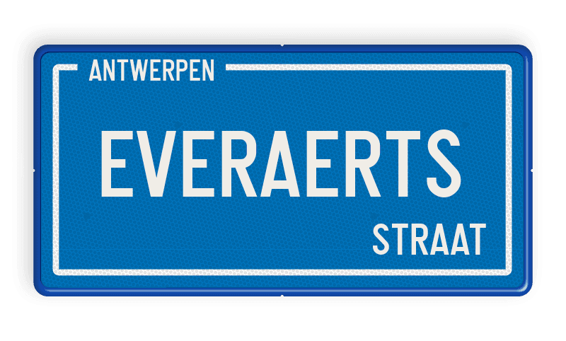 Belgisch Alum. straatnaambord met een dubbel omgezette rand met print van tekst / pictogrammen in reflectieklasse 3 (incl. anti-graffiti laminaat).